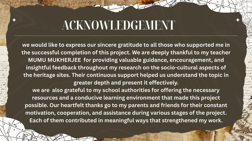 This presentation explores how Shantiniketan and the Victoria Memorial reflect the idea of “contribute and unite.” Both sites hold deep historical and cultural significance and play an important role in bringing people together through education, art, history, and tourism. Shantiniketan contributes to society through its artistic traditions, festivals such as Poush Mela and Basanta Utsav, and the preservation of Baul music, while also supporting local artisans and cultural exchange. The Victoria Memorial represents colonial history, architectural diversity, and collective memory, functioning as a museum and public space for learning and reflection. Together, these sites promote cultural unity, shared heritage, and social responsibility.